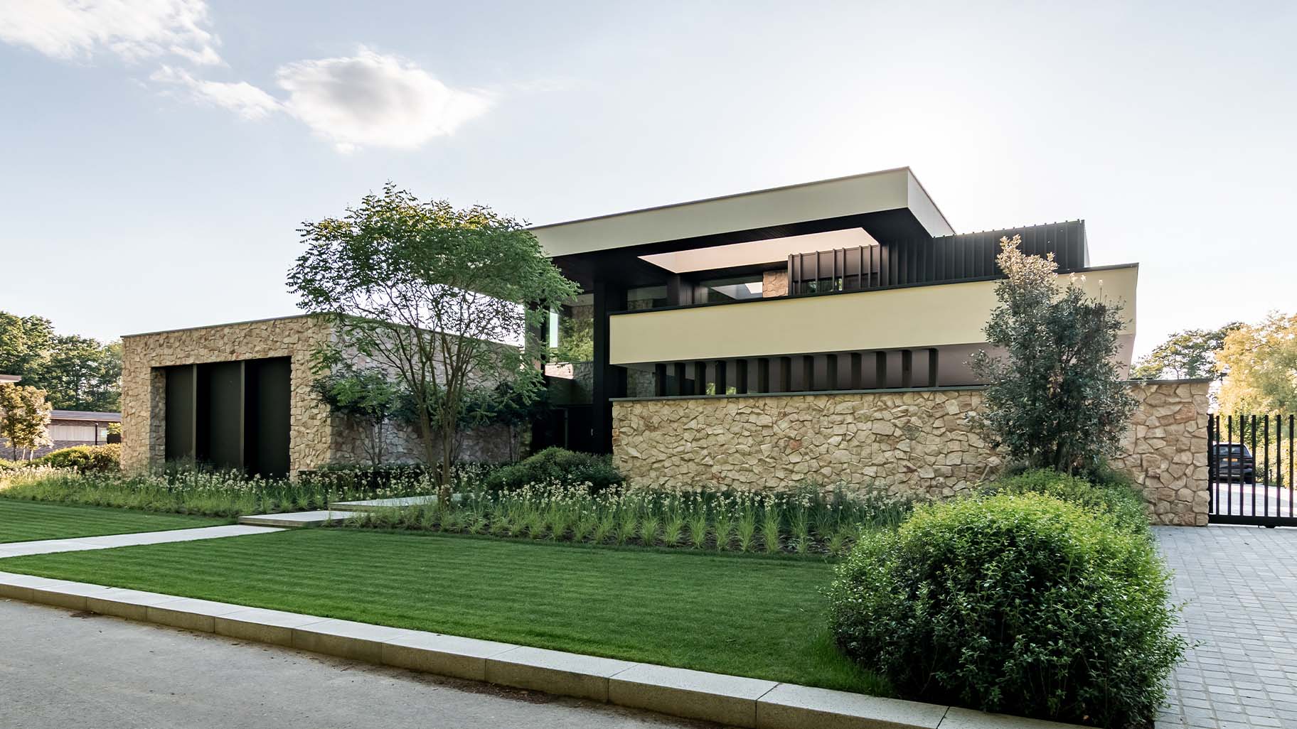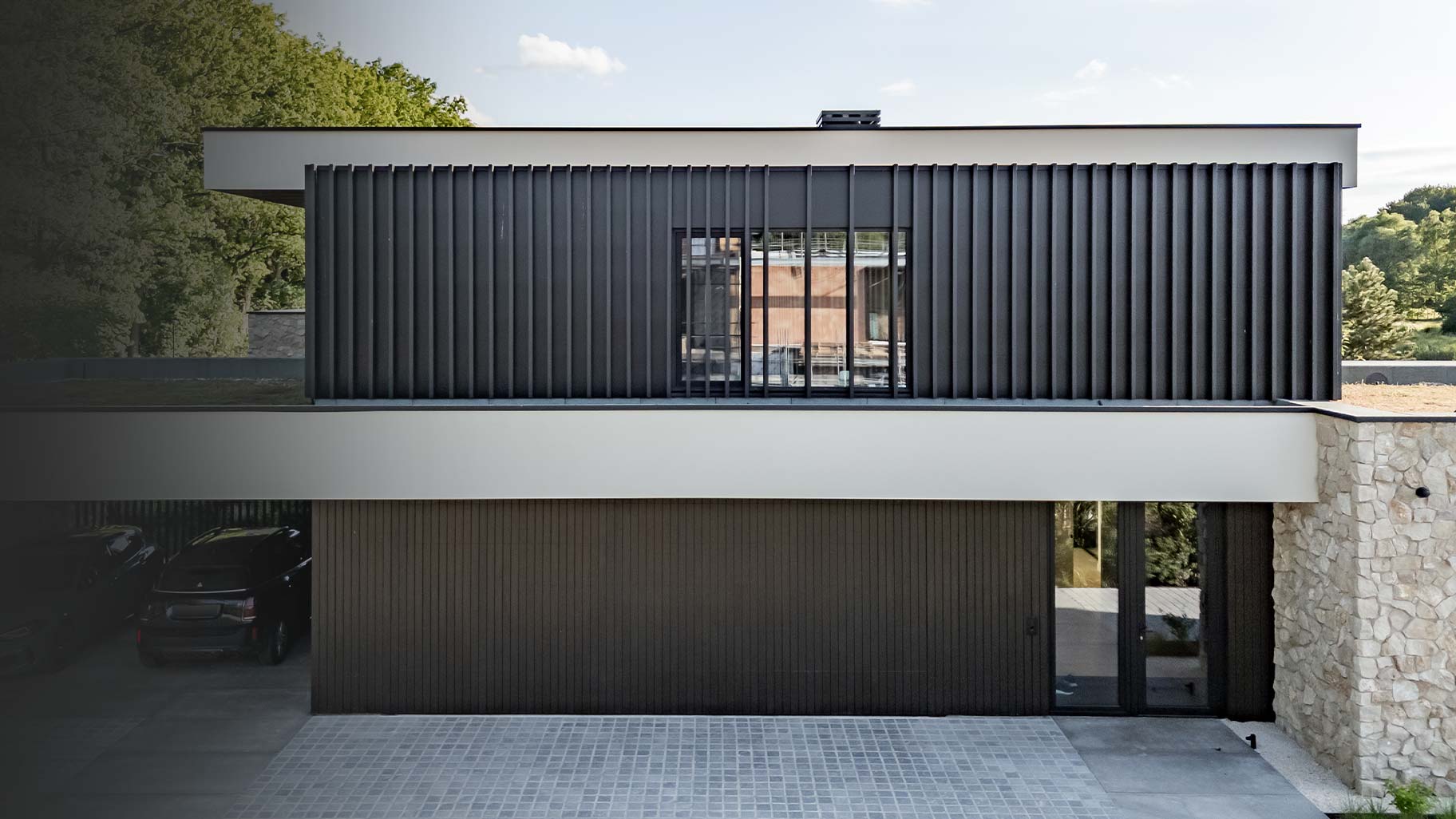 Een indrukwekkende nieuwbouwvilla met strakke lijnen, natuurlijke kleuren en hoogwaardige materialen. Onze houten sectionaaldeur, volledig onzichtbaar geïntegreerd in de gevel, sluit daar naadloos bij aan. De garagedeur is gemaakt van hetzelfde hout als de overige gevelbekleding, waardoor het geheel één sterke visuele lijn vormt. Indrukwekkend. Zowel gesloten als geopend.