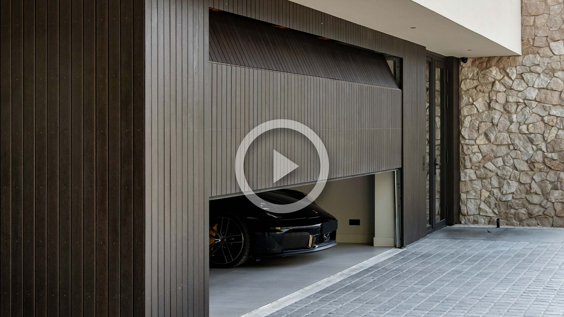 Een indrukwekkende nieuwbouwvilla met strakke lijnen, natuurlijke kleuren en hoogwaardige materialen. Onze houten sectionaaldeur, volledig onzichtbaar geïntegreerd in de gevel, sluit daar naadloos bij aan. De garagedeur is gemaakt van hetzelfde hout als de overige gevelbekleding, waardoor het geheel één sterke visuele lijn vormt. Indrukwekkend. Zowel gesloten als geopend.