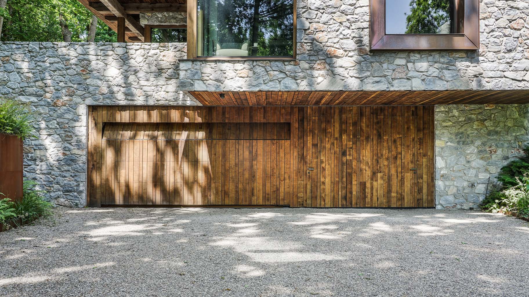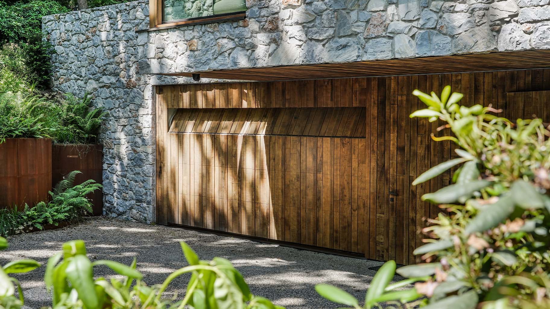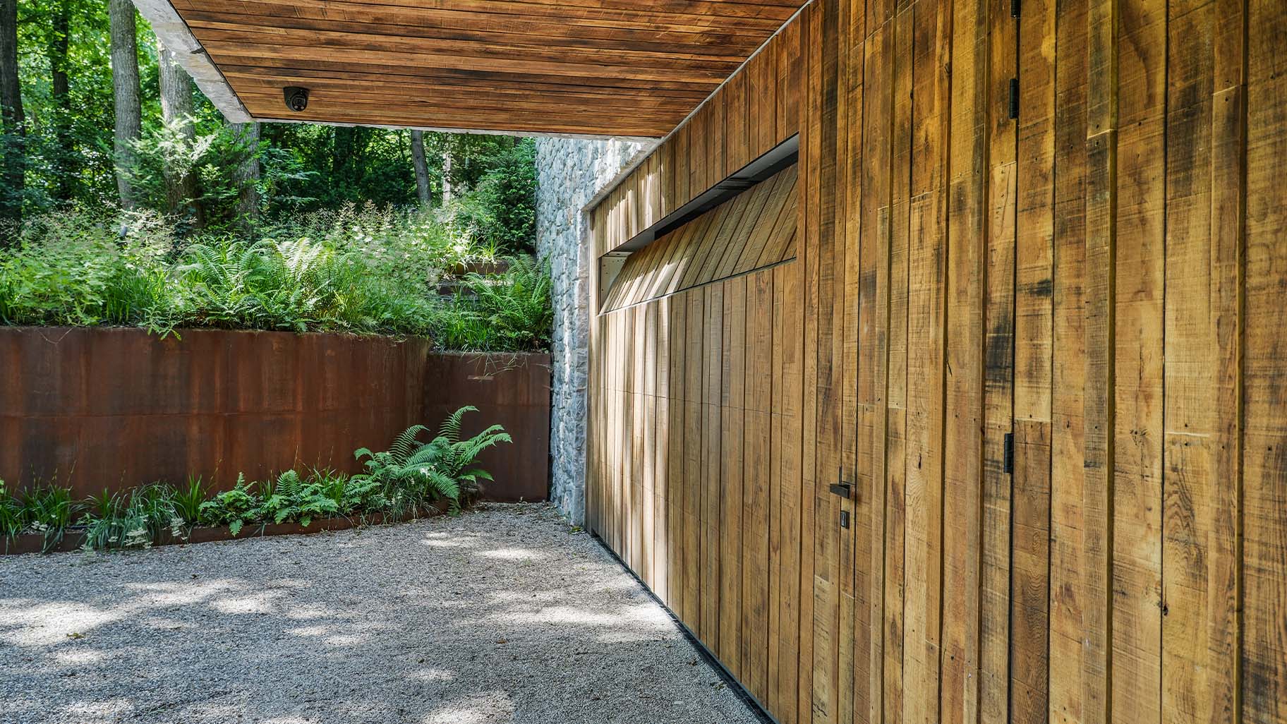 Eikenhouten garagedeur bij strakke bosvilla