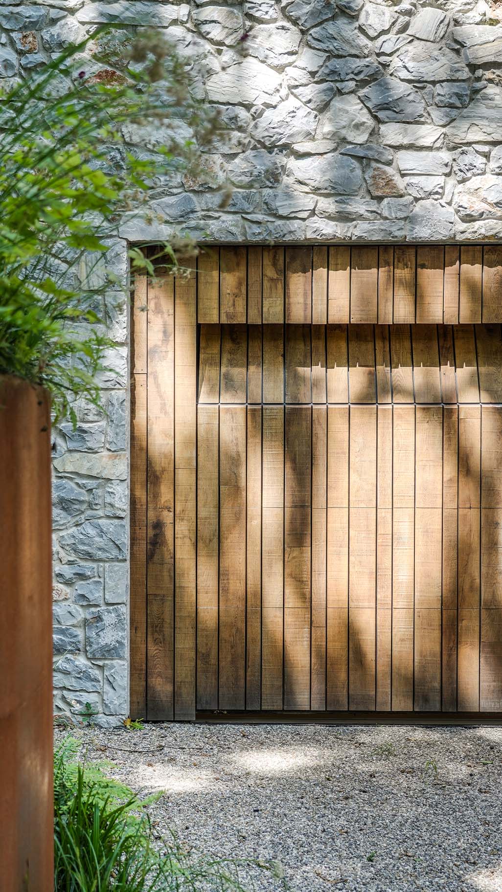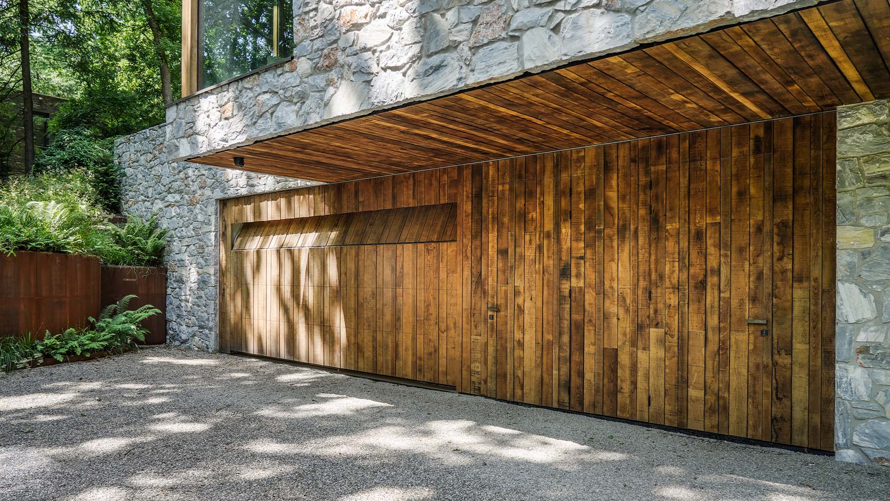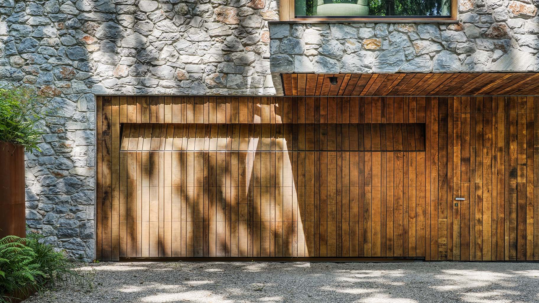 Eikenhouten garagedeur bij strakke bosvilla