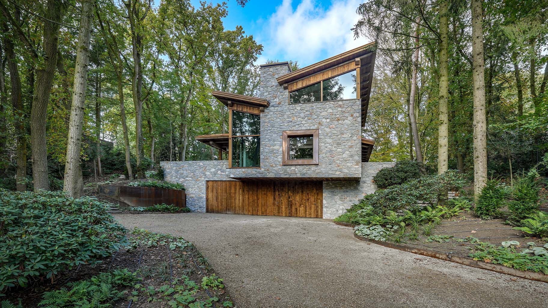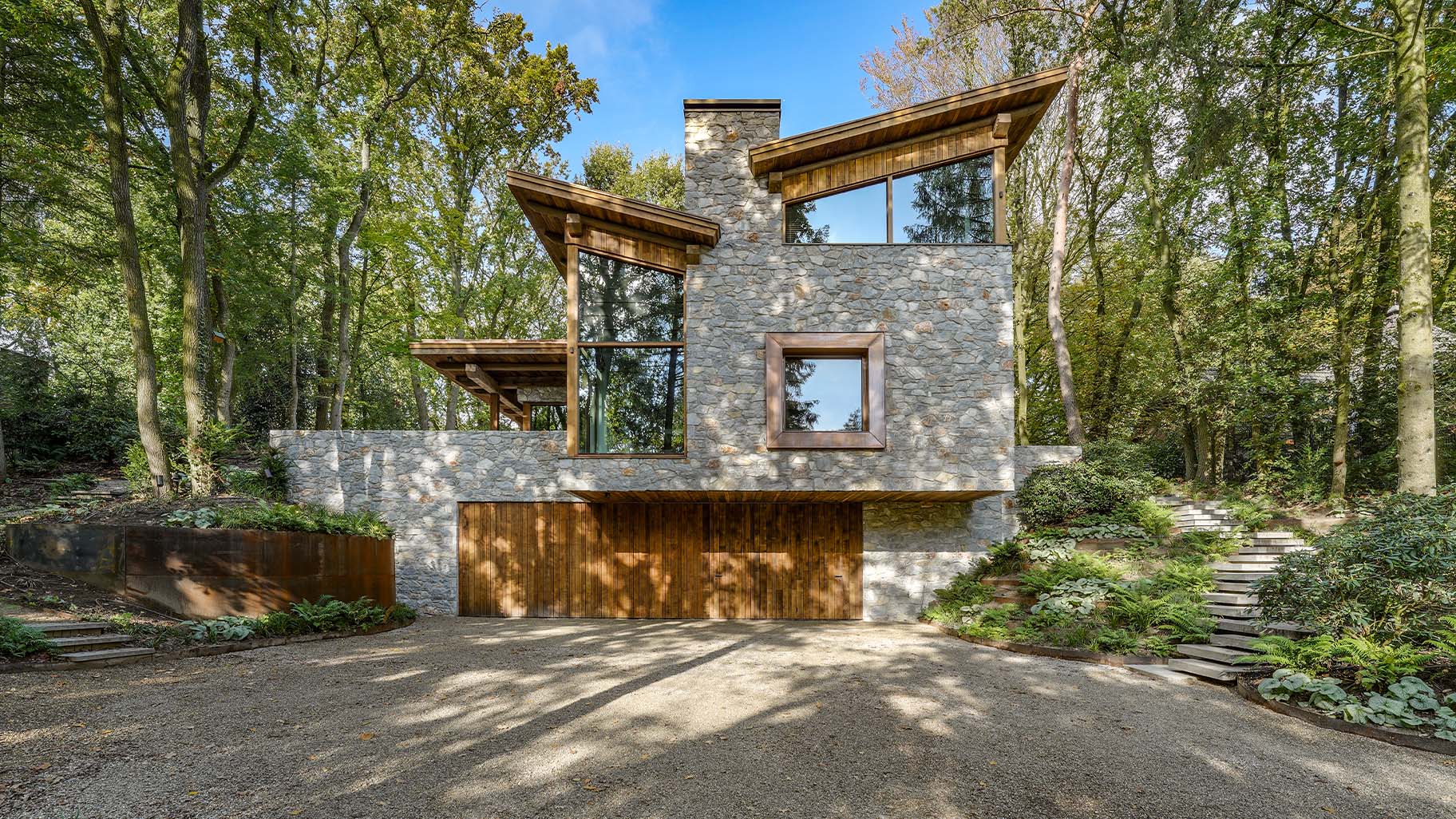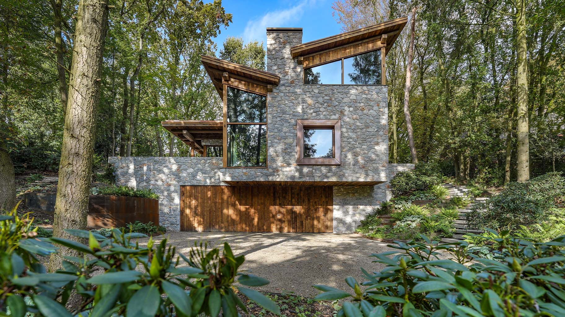 Te midden van het groen staat deze prachtige bosvilla die volledig opgaat in het landschap. De robuuste natuurstenen, grote glaspartijen en het warme hout nodigen uit om dichterbij te komen. Wat je dan zult zien, is dat we hier een prachtige Eikenhouten garagedeur hebben mogen plaatsen die volledig op gaat in de gevel.