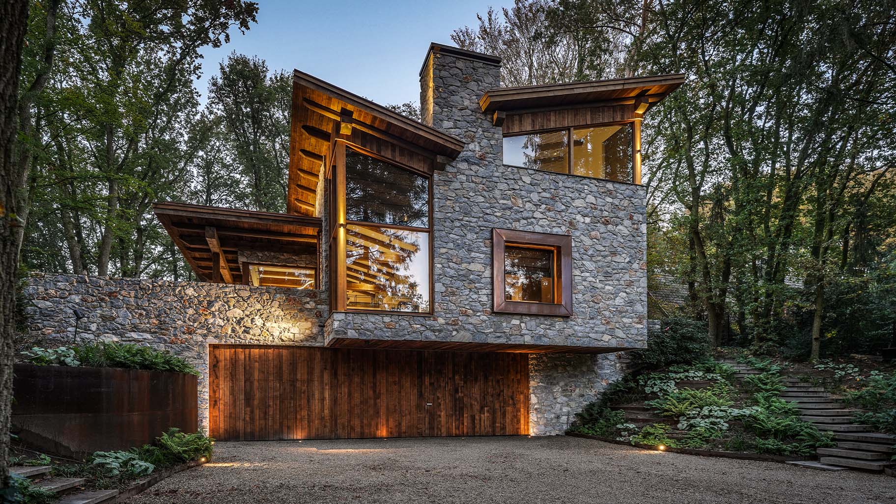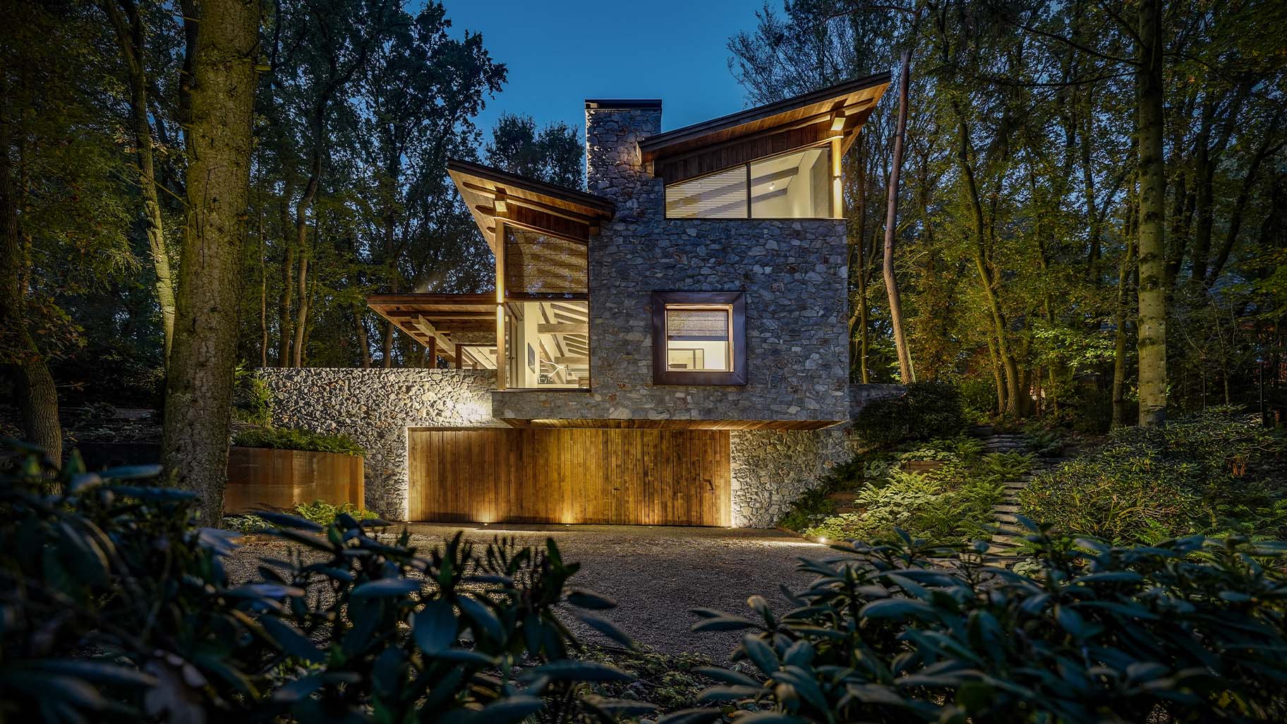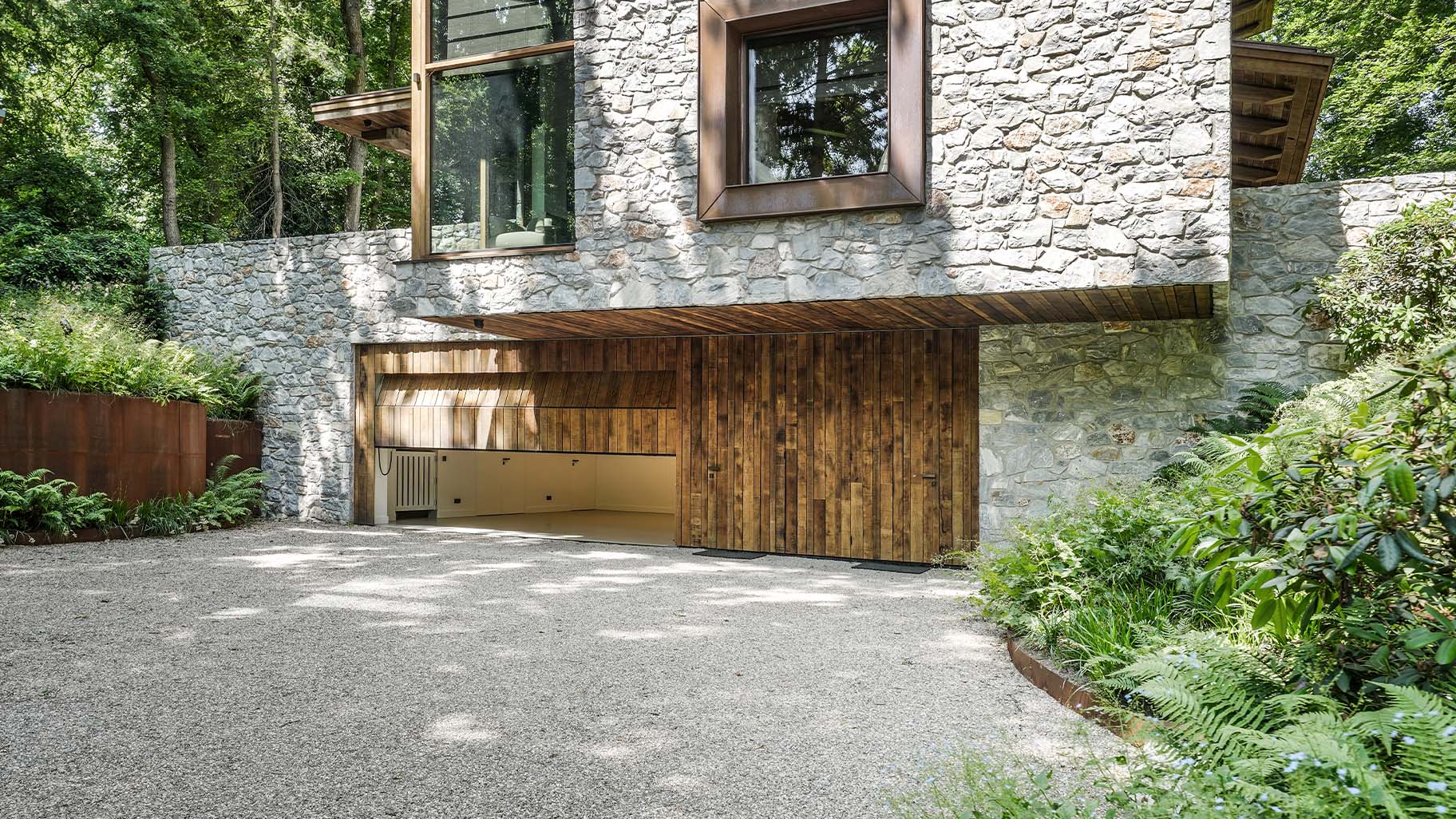 Te midden van het groen staat deze prachtige bosvilla die volledig opgaat in het landschap. De robuuste natuurstenen, grote glaspartijen en het warme hout nodigen uit om dichterbij te komen. Wat je dan zult zien, is dat we hier een prachtige Eikenhouten garagedeur hebben mogen plaatsen die volledig op gaat in de gevel.