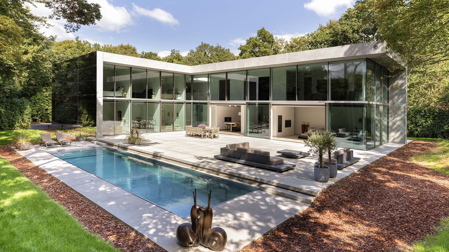 Deze buitengewone villa ligt aan een groene laan waar de woningen ver van de weg staan. Omdat de locatie zo uniek was, zou alles wat er gebouwd zou worden een verstoring zijn van de omgeving. De oplossing was even gedurfd als bijzonder: de woning laten opgaan in de omgeving. Dat is precies wat de spiegelgevel doet. En waar de woning dit doet met het landschap, laten wij de garagedeur verdwijnen in de gevel. De deur van 5,3 meter breed en 2,3 meter hoog is volledig opgenomen in het spiegelvlak.