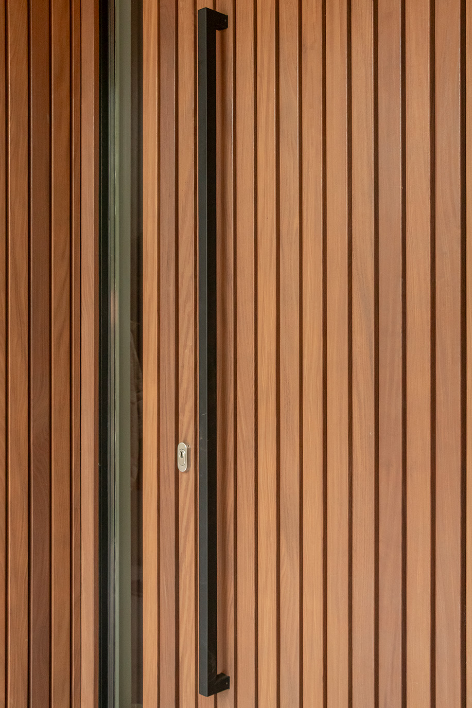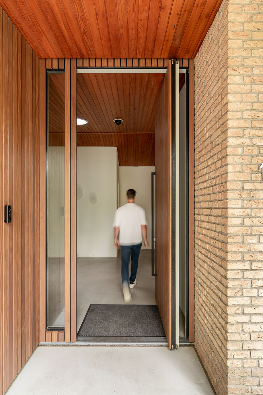 Bij deze moderne bungalow met verdiepte garage, midden in een bosrijke omgeving, hebben we niet één, maar vier Different Doors-deuren mogen realiseren: twee houten sectionaaldeuren, een loopdeur en een royale taatsvoordeur. Allemaal uitgevoerd in afrormosia hout met verticale latten. Eén uitstraling, vier toepassingen.