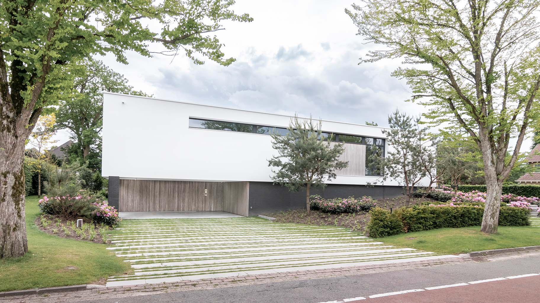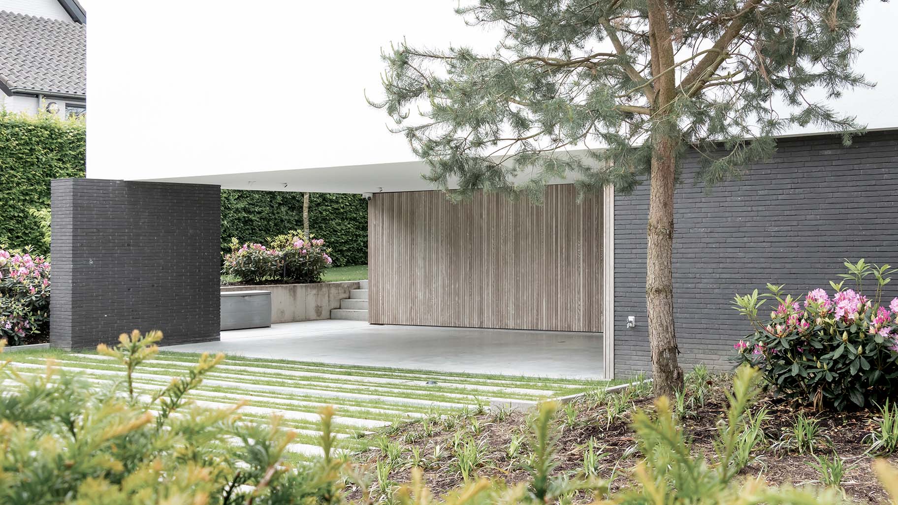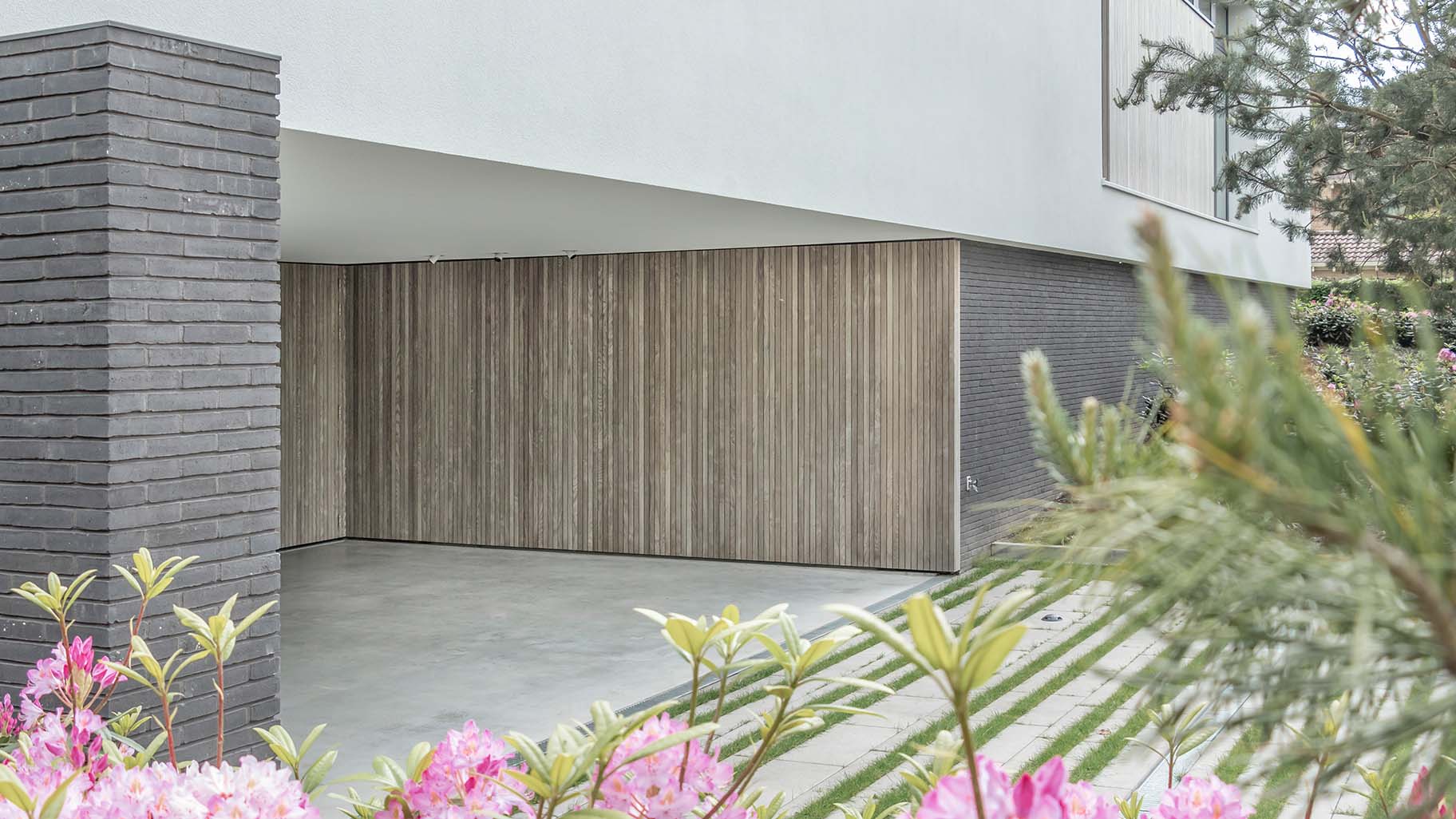 Een garagedeur die je pas ziet als hij opent – dat is het effect van deze perfect geïntegreerde zijwaartse houten garagedeuren. Van vloer tot plafond doorlopend, volledig gelijk met de gevel en onzichtbaar wanneer gesloten. Totdat de deuren open schuiven en een garage onthullen die net zo indrukwekkend is als de woning zelf.